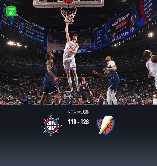 第四节快船科比-桑德斯拿下11分,雷霆以赛亚-乔拿下13分,最终快船110-128不敌雷霆
